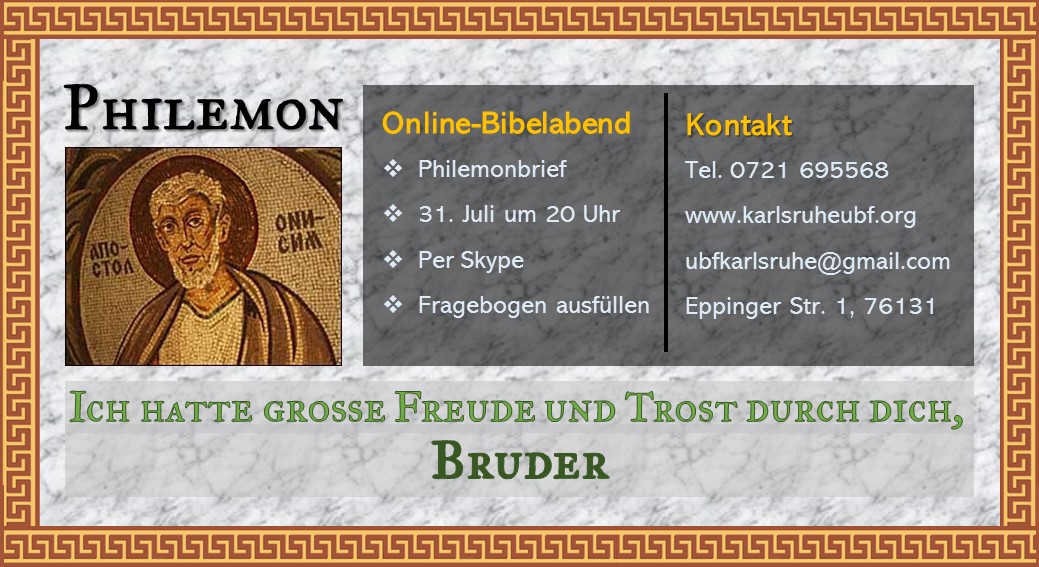 Juli 23, 2020Juli 23, 2020 Joseph Philemon 31.07 Ich hatte große Freude und Trost durch dich, Bruder! Wir laden ein zum gemeinsamen Online-Bibelabend. Thema: PhilemonbriefZeit: 31.Juli 2020 um 20 UhrWo: Per SkypeFragebogen: DOCX | PDF Wir freuen uns auf alle Teilnehmenden! Teilen mit: Auf X teilen (Wird in neuem Fenster geöffnet) X Auf Facebook teilen (Wird in neuem Fenster geöffnet) Facebook Gefällt mir Wird geladen … Ähnliche Beiträge